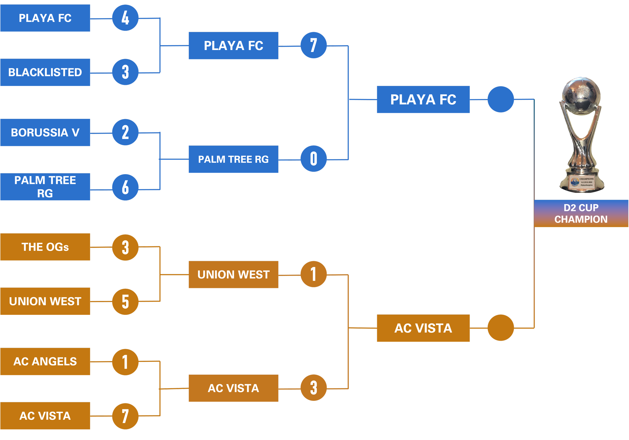 Division 2 Cup: Teams between 4th and 7th place from D2 (Saturday and Sunday) will play the Division 2 cup.